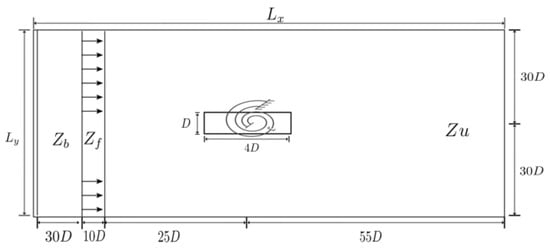 Our previous studies verified and validated that the IMERSPEC2D numerical code was developed [,,]. This study is an extension to investigate the behavior of a rectangular cylinder with an aspect ratio of 4. A rigid body was modeled using the dimensionless technique applied to the structural model. The proposed formulation used time increments of and .