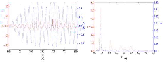 In Figure 13, the draft coefficient () at oscillated with low amplitude, around . The amplitude of these oscillations gradually increased by increasing . For , it exhibits an unstable and irregular behavior over time, suggesting a nonlinear dynamic response to the flow, with instability releases. The momentum () and lift () coefficients for indicated that the lift force contributed to the rotational structure instability, highlighted by the sharp increase in and the sharp decrease in . This suggests a dynamic interaction between the transverse and rotational oscillation modes of the structure, which is also observed by Robertson et al. []. Galloping frequency was in agreement with Kolahdouz et al. [].