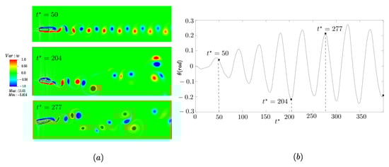 The coupling between the wake dynamics and the rotational response of the body. (a) Vorticity at three selected nondimensional time instants (, 204, and 277) during the flow around a rectangular cylinder with aspect ratio . (b) The temporal evolution of the angular displacement , with markers indicating the corresponding instants.