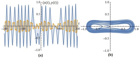 beginning with the constraints , where is either a fraction or an integer. The coefficients and are tiny parameters for . Equation (4) (see [,,]) represents the oscillatory motion of a buckled beam with simply supported or hinged ends for the modal displacement . The authors of [] provide several control strategies to stabilize the chaotic behavior of a fractional piecewise-smooth oscillator. The topic: chaos generation via , Melnikov’s approach and simulations are discussed for a modified model in the article []. More precisely, the authors investigate the dynamics of the new extended oscillator class listed below []: