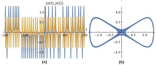 in this case, , , , and N is an integer. Ref. [] considers the use of tiny parametrical perturbations to divert homoclinic chaos in a class of piecewise smooth oscillators to stable periodic orbits. More precisely, the authors explore the following extended differential model []: