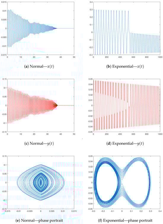 - The behavior of both types of oscillators can be viewed in Figure 9. The used parameters for the Gaussian oscillator are , , , , , , , and . We change only the variable p to for the exponential case. The intensity is assumed to be . The ODE systems are solved through the platform MATLAB2024a. There are several integrated solvers that use different numerical methods. The basic ones for non-stiff equations are ode23, ode45, ode78, ode89, and ode113—they are mainly based on the large Runge–Kutta family. On the other hand, stuff equations can be solved through ode15s, ode23s, ode23t, and ode23tb. Our choice falls on the ode45 that is based on the Dormand–Prince modification of the Runge–Kutta method—see []. The main reasons is that there is no evidence for a possible stiffness as well as its large applicability. Furthermore, some experiments based on the other solvers lead to non-significant differences in the behavior. For more details on the different numerical methods and their implementation in MATLAB, we refer to Chapter 7 of [].