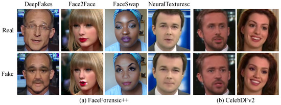- Rossler, A.; Cozzolino, D.; Verdoliva, L.; Riess, C.; Thies, J.; Nießner, M. Faceforensics++: Learning to detect manipulated facial images. In Proceedings of the IEEE/CVF International Conference on Computer Vision, Seoul, Republic of Korea, 27 October–2 November 2019; pp. 1–11. [Google Scholar]