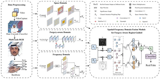 To overcome these limitations, we propose a forgery-aware guided spatial–frequency feature fusion network. Based on both spatial and frequency domain features, we introduce a forgery-aware module (FAM) and a symmetry analysis mechanism to integrate spatial semantics, spectral cues, and forgery saliency into a unified detection framework. This design enhances the model’s ability to focus on manipulated regions and improves feature interaction and the completeness of feature representation.