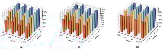 Comparison results of different methods on four evaluation metrics (ACC, AUC, F1, and G-Mean) across three datasets: (a) FF++ (C23), (b) FF++ (C40), and (c) Celeb-DFv2. The methods from a to h represent ViT, MLFFE_ViT, NPR, EfficientNet-B4, Xception, GocNet, GFFD, and the proposed method, respectively. The proposed method shows consistently superior performance under all settings.