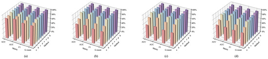 Comparison across Different Datasets: To conduct a fair and consistent evaluation, several representative and state-of-the-art face forgery detection methods were re-implemented under identical training settings. All models were evaluated on three standard benchmarks: FF++ (C23 and C40) and Celeb-DFv2. The performance results, summarized in Table 2, demonstrate that the proposed method consistently outperforms these baselines across all metrics—accuracy (ACC), area under the curve (AUC), F1-score, and geometric mean (G-Mean). In particular, the proposed model achieves an AUC of 98.96% on FF++ (C23), 84.52% on FF++ (C40), and 99.71% on Celeb-DFv2, outperforming GFFD by margins of +0.7%, +0.36%, and +0.08%, respectively. While GFFD performs strongly on FF++ (C23), it suffers from performance degradation under higher compression settings such as FF++ (C40), indicating sensitivity to compression artifacts. In contrast, our method maintains robustness under varying compression levels, attributable to the combination of spatial–frequency domain modeling and the forgery-aware saliency-guided fusion module. Compared to GocNet, which introduces gradient-based analysis for forgery localization, our approach demonstrates more stable performance on compressed datasets, suggesting improved generalization. Additionally, the NPR framework—designed to enhance generalizability by revisiting upsampling design—shows competitive results on FF++ (C23) but falls behind in heavily compressed and cross-domain scenarios. Similarly, the MLFFE_ViT architecture improves upon ViT through wavelet decomposition, yet still underperforms the proposed method, particularly in terms of robustness and G-Mean. The visual comparisons in Figure 4 further illustrate the superiority of the proposed method across all evaluation metrics and datasets.