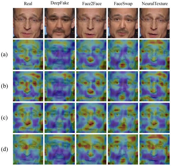 To further investigate the role of each component in enhancing forgery-aware perception, we conducted a module-level ablation visualization experiment on four representative forgery types (deepfake, Face2Face, FaceSwap, and NeuralTexture) within the FF++ (C23) dataset. Specifically, based on the Grad-CAM visualization technique, we present activation heatmaps under four network configurations, (a) Full Spatial Branch, (b) Full Frequency Branch, (c) Spatial + Frequency, and (d) Spatial + Frequency + FAM, as illustrated in Figure 6. The results show that using spatial features alone (Full Spatial Branch) leads to generalized attention patterns mainly focused on facial contours, which makes it difficult to accurately localize manipulated regions. In contrast, using only frequency features (Full Frequency Branch) yields scattered responses, which are susceptible to spectral interference from non-forged regions. When spatial and frequency features are combined (Spatial + Frequency), the activation gradually concentrates on core areas such as the mouth and nasal wings, indicating strong complementarity between the two domains in identifying tampered regions. With the addition of the FAM (forgery-aware module), the network’s attention becomes more focused on specific manipulated areas. In global forgery cases like deepfake and FaceSwap, the heatmaps concentrate on edge-blending regions. For local manipulations such as Face2Face and NeuralTexture, the model accurately highlights subtle changes in the mouth region, demonstrating enhanced sensitivity to localized forgeries. These visualization results confirm that the saliency-guided mechanism significantly improves the model’s perception of local forgeries and further strengthens the cooperative representation between spatial and frequency features. This contributes critically to fine-grained forgery localization.