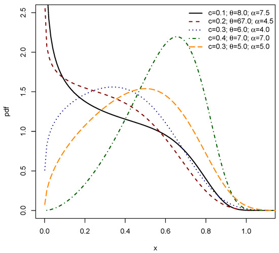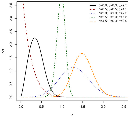 Figure 1 and Figure 2 collectively illustrate the substantial flexibility of the PDF for the EPS distribution, parameterized by c, , and . Figure 1 showcases the capacity of the EPS distribution to exhibit various unimodal shapes, ranging from markedly right-skewed (as seen with the black, red, blue, and orange curves) to distinctly left-skewed (exemplified by the green dashed–dotted curve). These plots demonstrate that varying the parameters allows the mode of the distribution to shift across the range of x values, accommodating different central tendencies and degrees of asymmetry in the data. Figure 2 further highlights the versatility of the EPS distribution, particularly its ability to model shapes commonly encountered in survival and reliability analysis. The black and red dashed curves, with their sharp initial peaks near zero followed by a decline, indicate a decreasing PDF shape, which is characteristic of phenomena where events are more likely to occur early in the observation period. Most notably, the green dashed–dotted curve in Figure 2 demonstrates a complex, irregular shape, suggesting that the EPS distribution is capable of capturing more intricate data patterns beyond simple unimodal or monotonically decreasing forms. The orange dashed–dotted curve in this figure provides another example of a unimodal, right-skewed shape. Together, both figures affirm that by adjusting its three parameters, the EPS distribution can adeptly fit a wide array of empirical data distributions, including those with varying skewness, different peak locations, and even non-standard or decreasing probability densities, making it a robust tool for diverse modeling applications.