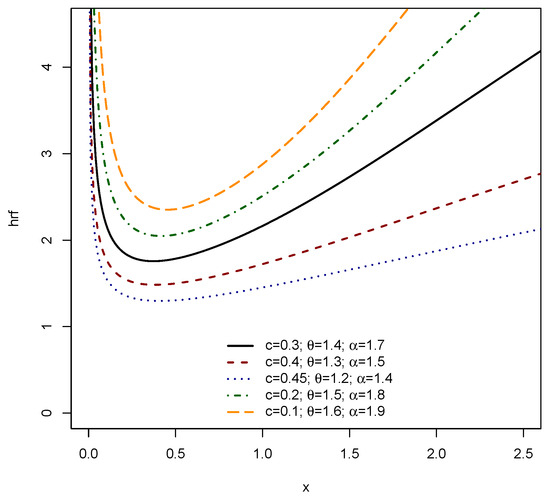 Figure 3 and Figure 4 graphically depict the versatility of the EPS distribution in modeling various shapes of the HRF, which is crucial for understanding instantaneous failure rates in survival and reliability analysis. Figure 3 demonstrates the EPS distribution’s capacity to exhibit the widely recognized bathtub shape, where the hazard initially decreases, remains relatively constant, and then increases. This figure also illustrates the ability to capture continuously increasing and decreasing hazard rate patterns depending on the chosen parameter combinations of c, , and . Complementing Figure 3, Figure 4 further accentuates the diverse HRF shapes achievable by the EPS distribution. It reinforces the presence of prominent bathtub shapes, along with clear examples of increasing and decreasing hazard functions. Notably, some parameter settings in Figure 4 demonstrate scenarios where the hazard rate can be nearly constant or exhibit sharp, pronounced decreases, indicating early life failures. The broad range of HRF configurations across both figures underscores the inherent flexibility of the EPS distribution, making it highly adaptable for modeling complex time-to-event data that might exhibit different risk characteristics over time, from early life reliability issues to wear-out phases or simply monotonically changing risk profiles.