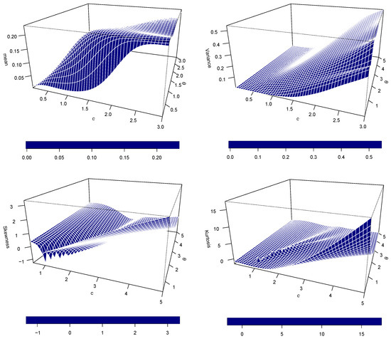 Figure 5 evidently illustrates the influence of parameters c and on the most significant statistical moments of the EPS distribution: mean, variance, skewness, and kurtosis. Mean and variance plots exhibit a typically homogeneous tendency. Both moments increase as a function of c and . Exactly, for a fixed , there is an initial steep increase with c (by some 2.0–2.5), after which the rate of increase slows down, suggesting saturation or asymptotic behavior. Similar positive correlation with increasing is observed, particularly when c is small. This close similarity in behaviour between the mean and variance indicates that while the central tendency of the distribution itself varies as a result of changes in c and , its overall variability increases proportionally.