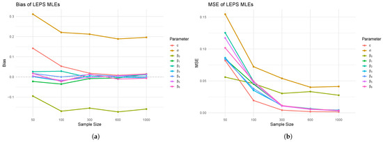 The EPS distribution is simulated over three scenarios to examine the validity of MLEs. The acceptance–rejection technique is employed to simulate random samples of size from the distribution. The aforementioned procedure is replicated 1000 times, and the average estimates (AEs), biases, and mean squared errors (MSEs) are calculated.