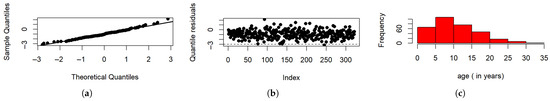 where is the log-likelihood function in Equation (), k is the number of parameters, n represents the sample size, and is the vector of parameters. For the EPS model, For the goodness-of-fit test, let be an ordered random sample from the EPS , where c, , and are unknown. The Cramér–von Mises , Anderson–Darling , and Kolmogorov–Smirnov statistics are computed using the following: