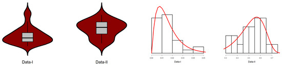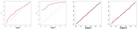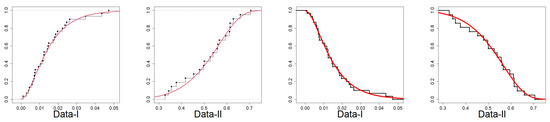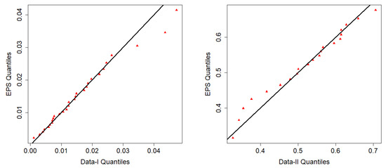 In Figure 8, the data plot for Data-I overlays a violin plot with an embedded boxplot and a histogram with a superimposed density curve. The histogram indicates right-skewness with dense low values and an elongated tail. The red density curve verifies the skewness and identifies the peak at a low value. The violin plot also visually supports the shape of the distribution. The box plot shows a small median and a narrow interquartile range (IQR), which is characteristic of right-skewness. For Data-II, the histogram shows right-skewness, though perhaps less pronounced than for Data-I. The density curve supports this skewness. The violin and boxplot show slightly higher medians and IQRs than for Data-I. In Figure 9, i.e., the plot for Data-I, the empirical CDF (red line) closely matches the fitted EPS CDF (black line/dots), indicating a good fit. The same assertion can be made for Data-II on the basis of a similar trend to Data-I since the empirical and EPS CDFs closely match. The empirical survival function (red line) closely matches the theoretical survival function of the EPS. The TTT plot of Data-I in Figure 10 is concave up, reflecting an increasing hazard rate. Similar to Data-I, the TTT plot of Data-II reflects increasing hazard rate behavior. Data-I PP plot’s red dots are close to the diagonal, which provides a good fit of the EPS distribution. For the Data-II PP plot, the dots are also close to the diagonal and provide a strong fit for Data-II. In Figure 11, the quantiles of Data-I coincide closely with the quantiles of the EPS distribution with slight discrepancies. Similarly, Data-II quantiles follow theoretical EPS quantiles closely, confirming a close fit. Both datasets are right-skewed and appear more concentrated towards small values for Data-I overall. Both exhibit increasing hazard rates, as confirmed by the TTT plots. The EPS distribution provides a good and consistent fit to both datasets with respect to the following: empirical CDFs and survival functions, PP plots (probability correspondence), and QQ plots (quantile correspondence). The robustness of the overall fit with all the diagnostics provides evidence of the appropriateness of the EPS distribution as the model for both datasets.