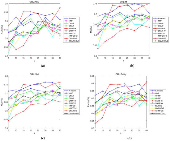 The clustering performance on ORL. (a) ACC; (b) MI; (c) NMI; (d) Purity.