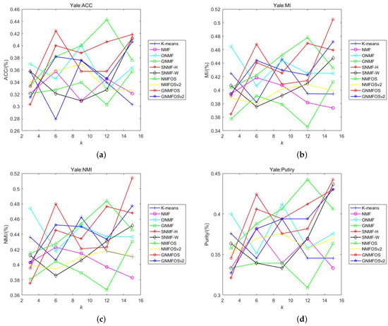 The clustering performance on Yale. (a) ACC; (b) MI; (c) NMI; (d) Purity.