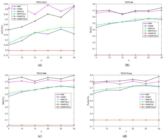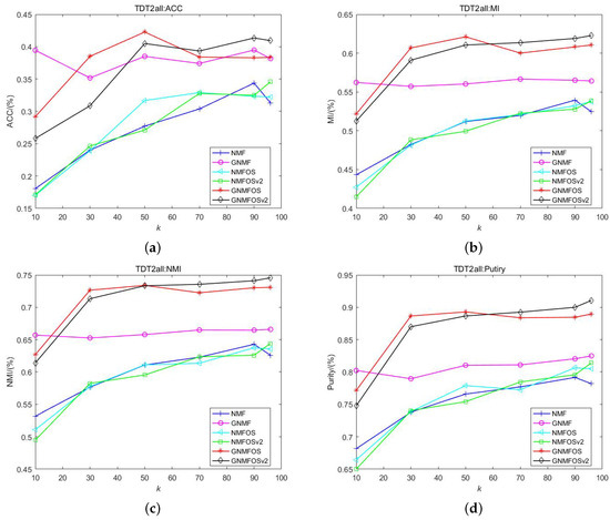 - Among the orthogonal-based algorithms, ONMF, NMFOS, NMFOSv2, GNMFOS, and GNMFOSv2, the clustering performance of the proposed GNMFOS and GNMFOSv2 algorithms is the best. This indicates that our algorithms enhance the clustering performance and improve the sparse representation capability based on NMF methods.