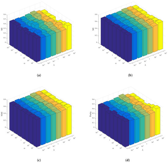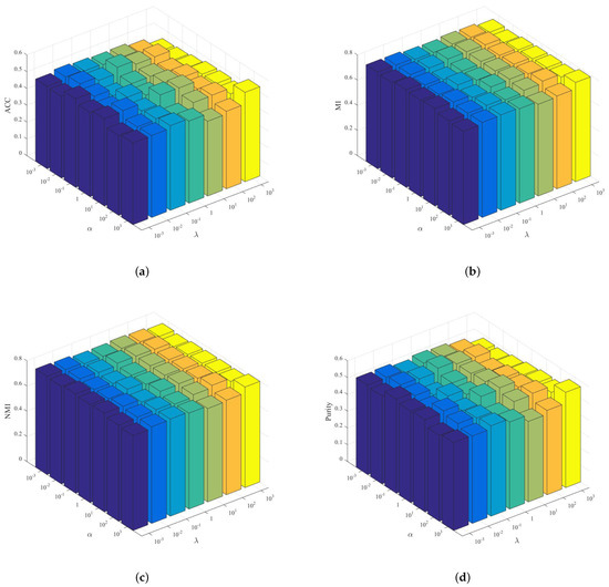 In Algorithms 1 and 2, there are four parameters: regularization parameter , orthogonality parameter , nearest neighbor point p, and in the denominator of Algorithm 2. Different parameter values will lead to different clustering results. To control variables and investigate the clustering effects of different algorithms, the experiments in Section 4.4.1 initially choose the same set of parameters: the maximum number of iterations , , , , and . In the parameter sensitivity subsection, different parameters will be further explored to identify the optimal parameters suitable for the algorithm.