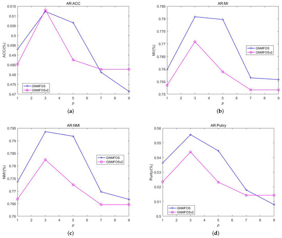 - For indicators of ACC, MI, NMI, and Purity, GNMFOS achieves the highest values at the same clusters’ number in AR dataset, while GNMFOSv2 outperforms GONMF at other cluster numbers. Overall, GNMFOSv2 has the highest clustering indicator values.