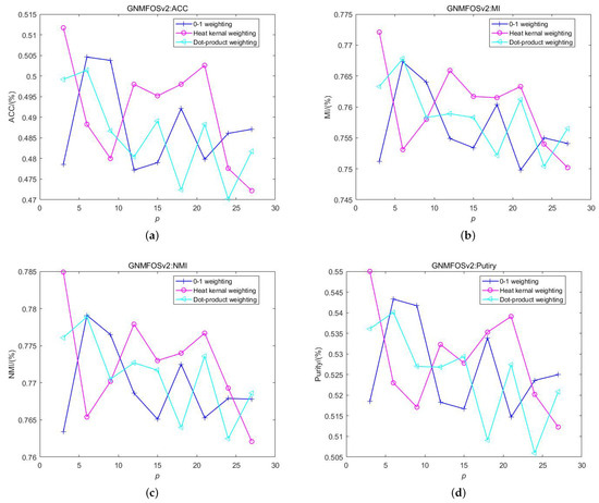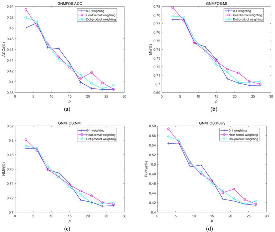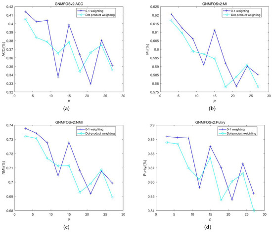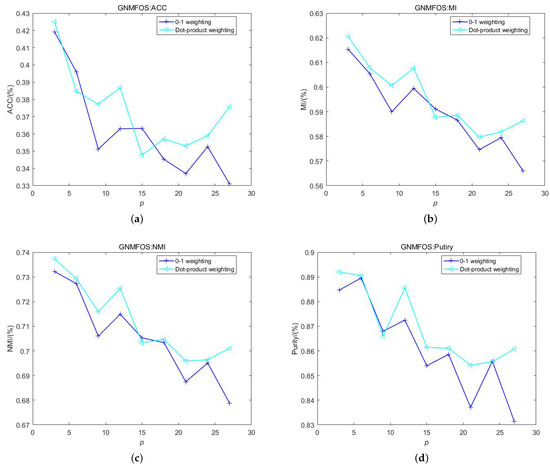 Figure 11 and Figure 12 illustrate the relationship between the clustering performance of the GNMFOSv2 algorithm with 0-1 weighting and dot product weighting schemes on the TDT2all document dataset as the number of nearest neighbors p varies. The cluster number is set to 96, matching the number of classes in the dataset. It can be observed that for the GNMFOS algorithm, the dot product weighting scheme performs better, especially when p is large. For the GNMFOSv2 algorithm, the 0-1 weighting scheme exhibits significant fluctuations. Specifically, at and , the values of the four clustering metrics are low, while at , the values are high. However, at , the clustering performance is optimal. Overall, the 0-1 weighting scheme is more suitable for the GNMFOSv2 algorithm.