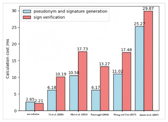 Compared with Wang et al.’s scheme [7], Mei et al.’s scheme [12], Li et al.’s scheme [29], Pournaghi et al.’s scheme [35], and Azees et al.’s scheme [34], the total computational cost of our scheme is reduced by 82.94%, 82.82%, 70.29%, 74.99%, and 91.18%, respectively. In addition, a bar chart is presented in this subsection for a clearer view of the comparison results, as shown in Figure 2. Therefore, the proposed scheme is more efficient in pseudonym generation, signature creation, and signature verification.