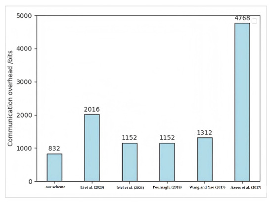 According to Table 3, compared with Wang et al.’s scheme [7], Mei et al.’s scheme [12], Li et al.’s scheme [29], Pournaghi et al.’s scheme [35], and Azees et al.’s scheme [34], the total communication overhead of our scheme is reduced by 27.78%, 58.73%, 27.75%, and 82.55%, respectively. In addition, a bar chart pertaining to communication overhead is given for a clearer view of the comparison results, as shown in Figure 3. It can be observed in Figure 3 that the communication overhead of the proposed scheme is lower than that of other schemes; that is, the total transmission length of the pseudonym, signature and timestamp is reduced, which effectively saves the transmission bandwidth and storage overhead at the receiver. Therefore, the proposed scheme also has more advantages for communication, and is more suitable for the field of IoVs with low requirements for transmission bandwidth and storage overhead.