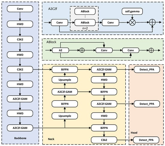 Compared to traditional feature concatenation methods, BiFPN introduces a learnable dynamic weight allocation mechanism that adaptively adjusts channel contributions in cross-scale feature fusion, effectively eliminating noise interference and reducing feature redundancy [23]. By constructing bidirectional cross-scale connections in the Neck layer of YOLOv12, it enhances sensitivity to small objects while maintaining localization accuracy for large-scale defects, thereby strengthening the detection model’s generalization capability and inference speed.