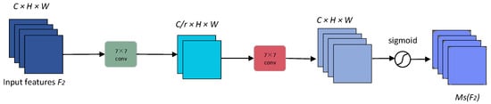 where and are learnable parameters, denotes the reduction ratio, denotes the ReLU activation function for sparse gradient propagation, and represents the sigmoid function, contrasting through smooth probability mapping.
