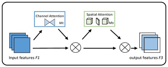 The feature maps first undergo channel attention to recalibrate semantic importance across channels, then pass through spatial attention to refine positional features, achieving dual cross-dimensional calibration. The final output preserves the original features through residual connections, with the overall architecture illustrated in Figure 4. The computational steps are detailed in Equations (6)–(8).