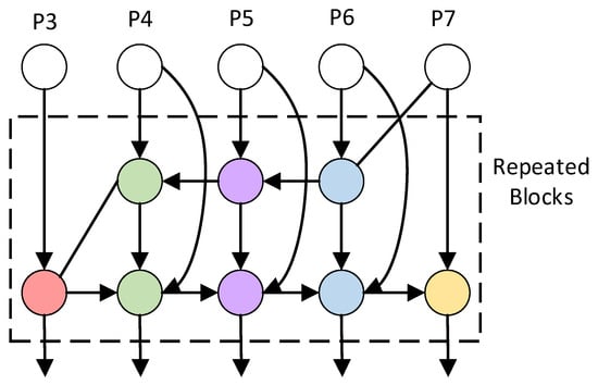 The BiFPN [22] dynamically optimizes hierarchical feature interactions through bidirectional cross-scale connections and learnable weighted fusion of multi-resolution features. Through interconnected bidirectional cross-layer links, it enables bidirectional integration of high-level semantic information with low-level spatial details. High-level features are upsampled and fused with adjacent lower-level features, while enhanced low-level features in the reverse path undergo downsampling for secondary fusion with higher-level counterparts. Repeated bidirectional propagation strengthens cross-scale contextual awareness, with all hierarchical output feature maps collectively contributing to detection head predictions. For input feature map at hierarchical level with varying resolutions, the mathematical formulations of the bidirectional cross-layer links are defined in Equations (13) and (14), respectively. The architectural diagram is illustrated in Figure 6.