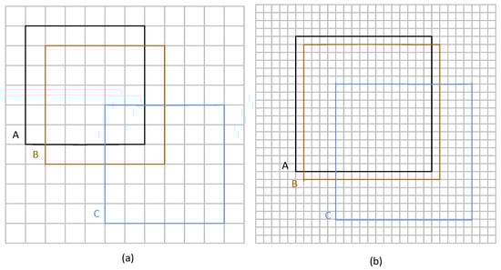 The sensitivity analysis of IoU across different object scales. (a) The tiny dimension object. (b) The normal dimension object. Box A represents the ground truth bounding box, boxes B and C denote the predicted bounding boxes.