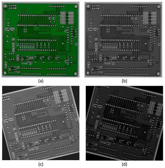 In this study the experimental data were derived from the publicly available PCB defect dataset PKU-Market-PCB [27], provided by the Open Lab on Human–Robot interaction of Peking University. As the primary dataset for comparative and ablation studies, it contains 1386 images covering six defect types: missing hole (Mh), mouse bite (Mb), open circuit (Oc), short circuit (Sh), spur (Sp), and spurious copper (Sc). Unlike other PCB datasets, this dataset presents distinct challenges for PCB microscopic defect detection due to uneven illumination and sparse defective samples. Following the methodology in [28], this study applied grayscale processing as well as rotation and brightness variation for image enhancement as shown in Figure 8. The rotation operation dynamically updates bounding box coordinates via an affine transformation matrix. Enhanced images with overlaid annotation boxes are visualized using LabelImg. Subsequently, the IoU values between original and transformed bounding boxes are calculated to filter out abnormal transformation results. The dataset underwent stratified random partitioning with proportional allocation ratios of 8:1:1 for training, validation, and test subsets, respectively, ensuring class distribution consistency across splits.