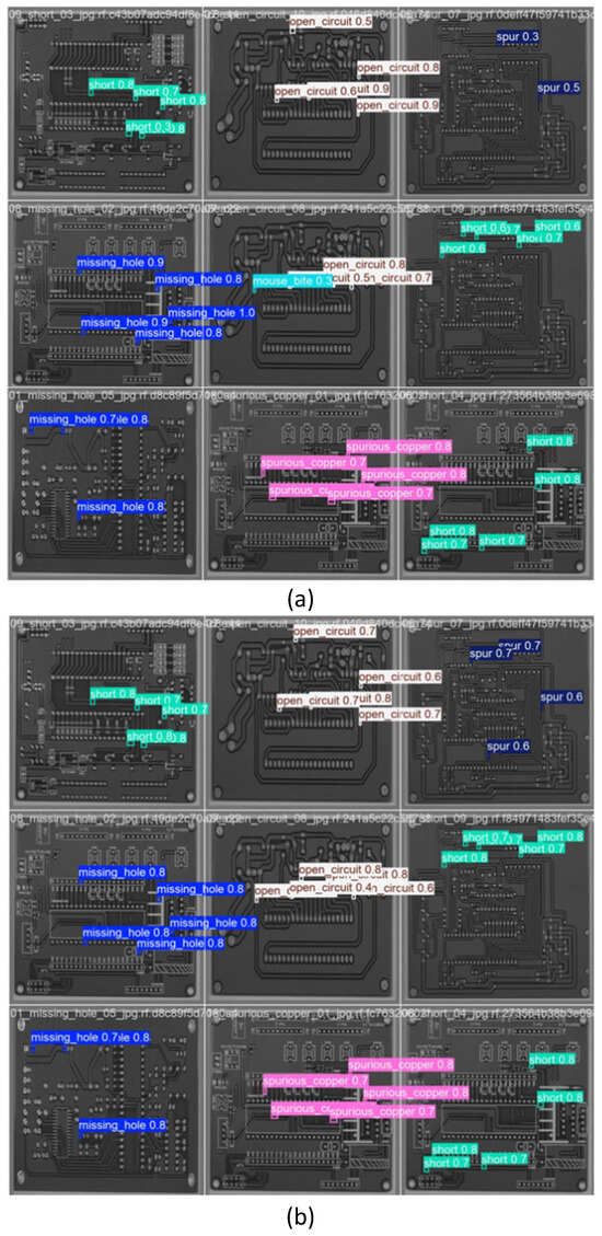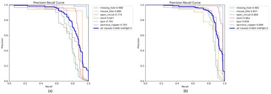 The experimental results shown in Figure 9 demonstrate that the proposed improved model achieves a mAP@50 of 90.4%, representing a 5.8-percentage-point absolute improvement over the baseline YOLOv12n model’s 84.6%, which fully validates the precision advantage of the enhanced solution in complex defect detection tasks. For six distinct defect categories, the improved model exhibits only marginal mAP value decreases of 0.7% and 2.3%, respectively, for detecting medium-to-large objects like missing holes and mouse bites compared to YOLOv12n, indicating that the attention mechanisms preserve localization accuracy for large objects. Significant enhancements are observed in detecting open circuits, short circuits, spur, and spurious copper defects, with the most notable improvement being an 11.5% AP increase for spurious copper detection, thoroughly demonstrating the technical superiority of multi-module collaborative optimization in micro-feature extraction and effectively confirming the high-precision detection capability of the proposed model for minuscule defects.