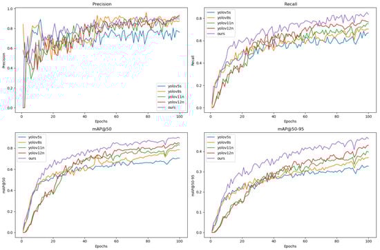 The experiment evaluated detection performance using metrics including Precision, measuring the accuracy of positive class predictions; Recall, reflecting the coverage capability of true positive samples; mean Average Precision mAP; model parameter count; computational complexity GFLOP; and frame rate FPS. Precision quantifies the model’s accuracy in predicting positive class samples, while Recall indicates its ability to cover all true positive samples, with their formal calculations defined in Equations (24) and (25).