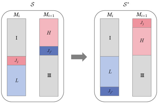 Step 3: Enforcing Heavy Job Monotonicity. Assume that the first violation of heavy job monotonicity occurs when a heavy job is assigned to machine , despite the existence of an earlier heavy job () that was previously assigned to a later machine with . In other words, is scheduled to a machine with a smaller index than a preceding heavy job, violating the required non-decreasing order of machine indices for heavy job assignments. We focus on this first violation, as depicted on the left side of Figure 2. Since machine was still available at the time was scheduled (i.e., ), light job monotonicity ensures that no light jobs could have been assigned to before . Therefore, all jobs on scheduled before must be heavy jobs, labeled as set in the figure. Let be the earliest such heavy job on .