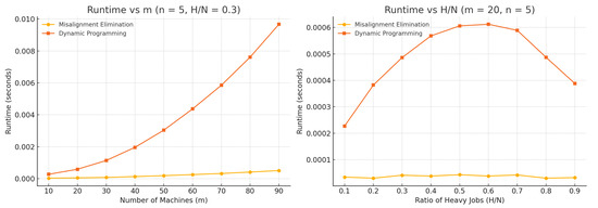 To evaluate the computational efficiency of the proposed misalignment elimination algorithm, a comprehensive runtime comparison was conducted against a baseline dynamic programming approach. The comparison focuses on two dimensions: the number of machines m, and the ratio of heavy jobs , under realistic scheduling configurations.