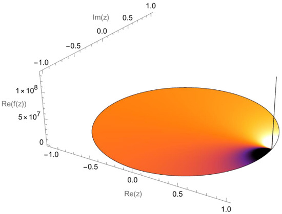 This 3D plot (Figure 1) shows the real part of the function over the unit disk . The surface height represents , while the color gradient reflects the imaginary part, giving a clear view of how both components behave. The black mesh and neutral lighting enhance the shape and highlight the singularity near .