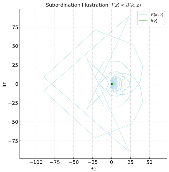 We evaluate both functions over a dense grid in the open unit disk and observe that the image of lies completely within the image of , thereby satisfying the subordination relation . Figure 2 shows this containment clearly.