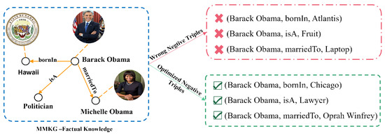 As shown in Figure 3, the left panel shows factual positive triples, and the right panel presents non-factual negative triples. Negative samples generated by random head/tail entity replacement are marked in red—both factually incorrect and semantically distinct from positive triples. By contrast, vision-guided negative sampling generates green-marked negatives, which, though non-factual, exhibit discernible semantic relevance to positive counterparts. The positive sample entities (Hawaii, Politician, and Michelle Obama) and the negative sample entities (Atlantis, Fruit, and Laptop) are almost completely dissimilar, and the triples containing the negative sample entities are semantically unreasonable in reality. This may cause the model to distinguish negative samples based on the entity type or name alone, incorrectly determining that any target entity with a Fruit as a relation should be a negative sample. However, if new negative samples that are similar to the positive sample entity appear, such as (Barack Obama, bornIn, and Chicago) or (Barack Obama, isA, and Lawyer), the model may struggle to discriminate effectively. In fact, while the triples (Barack Obama, bornIn, and Chicago), (Barack Obama, isA, and Lawyer), and (Barack Obama, marriedTo, and Oprah Winfrey) are factually incorrect, they share some semantic, identity, and relational relevance.