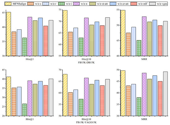 To validate the effectiveness of each component of the model, two variants were designed, and ablation experiments were conducted on two datasets using 20% aligned seeds. The first variant tests the contribution of each modality, and w/o s, w/o r, w/o i, and w/o n represent the removal of structural, relational, image, and numerical modalities, respectively. The second variant evaluates the fusion strategy and the accuracy of negative sample generation, and w/o st-att, w/o cr-att, w/o mlf, and w/o vgns represent the removal of st-attention, cross-modal fusion attention, multi-layer fusion module, and the vision-guided negative sampling mechanism, respectively. The experimental results are shown in Figure 4.