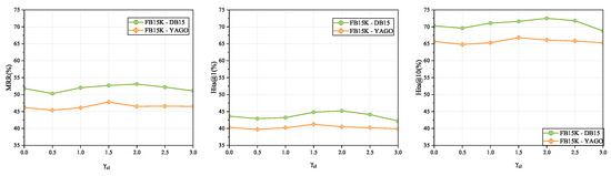 Performance of the model on FB15K-DB15K and FB15K-YAGO15K with different scaled alignment seeds. The reported results of ERMF are the average values of multiple repeated experiments; when referring to the results of ERMF hereinafter, this average value shall be used.