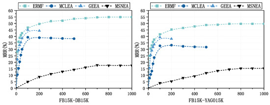 To demonstrate the robustness of the ERMF model, we compared the convergence speeds of different models. Figure 7 illustrates the variations in MSNEA, MCLEA, and GEEA at different epochs. Our observations indicate that EMRF reached a stable state around the 600th iteration on both datasets. In contrast, MCLEA was only partially trained for the first 500 rounds, and although it converged earlier, its final performance was not satisfactory. This could be attributed to the fact that MCLEA employs automatic weighted multi-task loss, which over-amplifies the loss weights of sparse modalities in scenarios of modality information imbalances (e.g., the low image coverage rate in FB15K-YAGO15K as shown in Table 1), leading to model overfitting in the early training stage and performance degradation in the later stage. GEEA converged around the 100th round, but its performance started to decline afterward. The potential reason is that GEEA optimizes via distribution matching and reconstruction loss, requiring entity embeddings to map to a normal distribution. However, this approach tends to trap the model in local optima during training, causing it to excessively focus on the normality of embedding distributions rather than semantic matching for entity alignment. While MSNEA and ERMF exhibited similar convergence speeds, MSNEA’s overall performance was lower. These experimental results demonstrate the stability of our model.