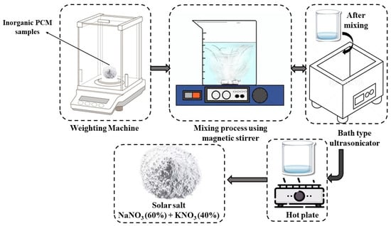 The schematic representation of pure solar salt is highlighted in Figure 1. The eutectic mixture of NaNO3 and KNO3 (60:40 wt ratio) is prepared by weighing 50 g of salts. Next, the salts are thoroughly mixed together. Then, 200 mL of demineralized water is added to the salt mixture, and the solution is stirred with a magnetic stirrer (900 RPM). This vigorous agitation is repeated until depth of dissolution is achieved, usually within a time frame of approximately 3 h. Then, an ultrasonicator is used to make the mixture more uniform and homogeneous. After the ultrasonication, the sample is dried at 180 °C to remove the water contents of the eutectic salt mixture, giving a dry physicochemical product [28]. The reason for selecting a drying temperature of 180 °C was to ensure the water content of the solar salt was effectively removed, taking into consideration that 180 °C was not close to the melting point or the on-start degradation temperature of solar salt, which are much higher.