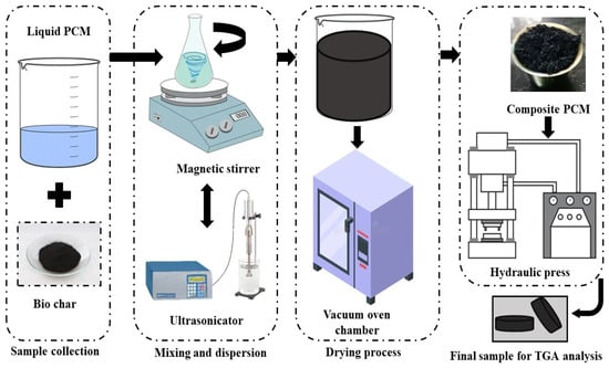 Biochar acts as an additive when working to prepare the composite phase change material (PCM). Overall, it is clear from the literature review that biochar is a great support material for improving the thermal conductivity of PCM materials. First, the biomass-derived expandable material is heated in a muffle furnace at a temperature of 200 °C to dry the sample. The eutectic salt mixture, consisting of NaNO3 and KNO3 in a 60:40 weight ratio, is weighed and mixed thoroughly. This mixture is combined with 200 mL of demineralized water and stirred using a magnetic stirrer at 900 RPM. During the continuous stirring process, biochar particles (20 wt.%) are gradually introduced into the solution. The well-blended composite eutectic sample undergoes further homogenization, using an ultrasonicator to ensure the uniform dispersion of biochar within the mixture. After homogenization, the composite mixture is heated to remove water, yielding a moisture-free sample. Finally, the sample is elevated to its melting-point temperature to complete the preparation process for the biochar-enhanced composite PCM. The procedure for the preparation of composite solar PCM salt is depicted in Figure 2.
