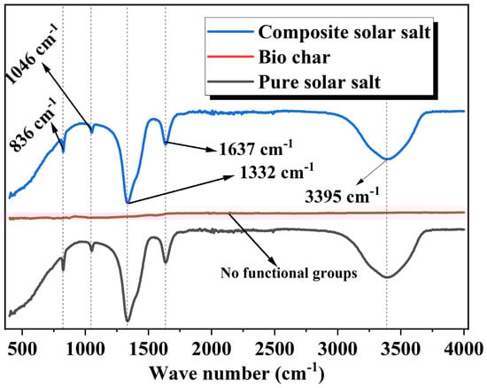 The composite solar salt phase change material underwent FTIR analysis after being held at temperatures below its decomposition threshold for 2880 h to evaluate its long-term stability in high-temperature environments. The FTIR spectra of the examined sample are illustrated in Figure 14, showing distinct peaks associated with NaNO3, KNO3, and biochar. Notably, no new peaks emerged during the extended exposure period, which suggests that the biochar particles remain inert and do not contribute to decomposition or initiate any new chemical reactions beneath the degradation onset temperature. These findings indicate that the composite PCM retains excellent chemical stability, even at elevated operating temperatures. Therefore, this prepared composite solar salt PCM exhibits outstanding durability over time under such conditions.