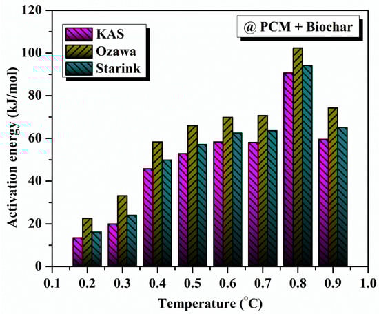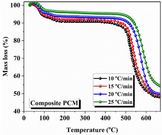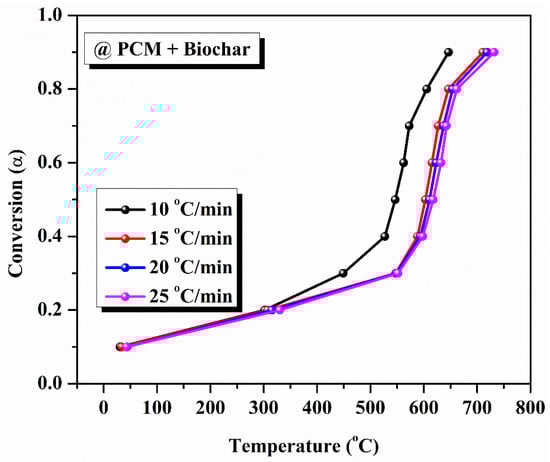 Figure 5 and Figure 6 show mass losses versus temperature, with all the samples displaying a single-stage decomposition profile. In these varying diagrams, the one-stage mass loss profile can be seen indicative of the one-stage thermal decomposition profile, occurring at the maximal temperature of the eutectic NaNO3-KNO3 mixture. Specifically, there appears to be a longer time frame at the temperature range where there is no mass loss; then, rapid mass loss occurs at the onset temperature of degradation. The derivatives of the mass loss rates show all three ramp rates. The onset temperatures were 670.24 °C, 702.76 °C, and 730.15 °C, respectively; this was the fast-decomposition first-order reaction where the most mass lost (~80%) was seen, with thermal decomposition clearly occurring between 680 °C and 900 °C, shown by the steep downward trajectories of the kinetic parameters at the higher ramp rates. The decomposition reaction occurred more quickly, as suggested by the thermal hysteresis, showing that there truly was not much of a time frame for the material to equilibrate prior to mass loss being observed. Beyond 900 °C, the curves can be seen to flatten, suggesting almost total thermal decomposition (the recovery mass was essentially negligible at this point). However, the curves in Figure 6 show far more gradual mass loss to ~550 °C, with an incline, and the curves become sharper as mass begins to decline, indicating the first signs of thermal degradation between 556.58 °C and 569.64 °C, as noted in Section 5. The mass loss and the rate of increase in degradation were compounded compared to block heating rates with respect to the impact of thermal hysteresis on the thermal decomposition relative to the heating rate, which was lowest at higher heating rates (25 °C/min; 565.37 °C) versus lower heating rates (10 °C/min; 556.58 °C), causing some blocking of heat transfer via the biochar packing method. This suggests to us that the biochar would reduce thermal stability and likely be continuously updated with pure PCM rather than composite PCM to display onset at 670.24 °C.