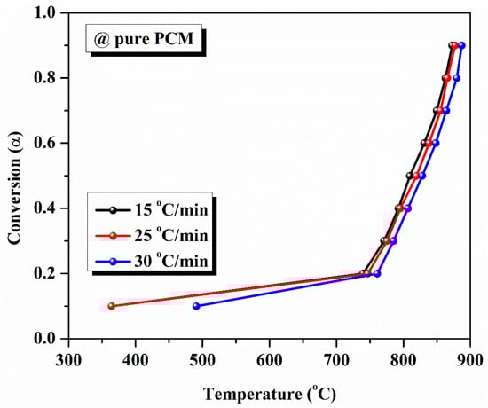 where is the initial mass of the PCM sample, is the mass of the sample at reaction temperature, and is the final residual mass of the PCM sample after complete decomposition. Expressed as a kinetic rate equation with conversion, the Arrhenius expression used is shown in Equation (3) [25]: