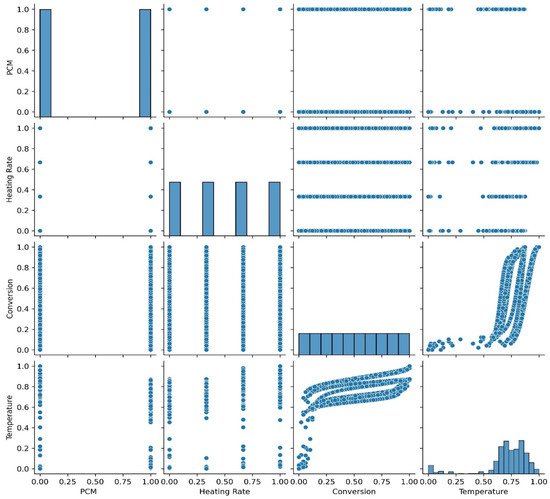 Figure 11 shows the pair plot of the TGA dataset, which effectively aids in exploratory data analysis by helping to examine relationships between input features. It displays scatter plots for each pair of variables, making it easier to identify correlations, patterns, and potential outliers. The diagonal plots illustrate feature distributions, providing valuable insights into data spread. From Figure 11, it is evident that as the heating rate (°C/min) increases, the temperature (i.e., °C) rises significantly. Additionally, the presence of biochar has a notable impact on the degradation temperature of the PCM sample, lowering the operating temperature at each heating rate.