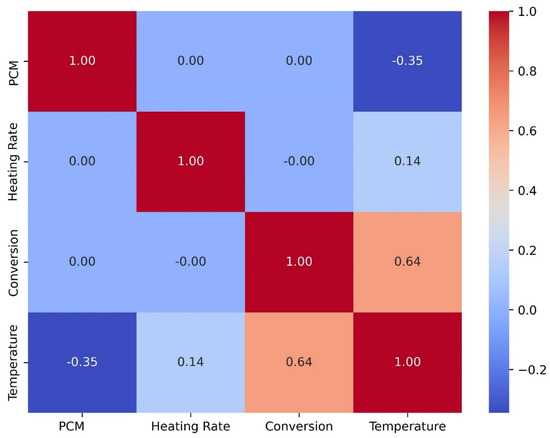 Figure 12 displays a heatmap plot. This is a crucial visualization tool in machine learning, primarily used for correlation analysis to identify relationships between features and detect multicollinearity, aiding in effective feature selection. Additionally, heatmaps are commonly employed to evaluate model performance, such as visualizing a confusion matrix in dataset. The analysis utilizes the Pearson correlation coefficient (PCC) to assess the connections among dependent and independent variables. The PCC, ranging from −1 to +1, quantifies the linear correlation between these variables. A PCC coefficient approaching 1 signifies a strong direct linear relationship, while values near −1 indicate a significant inverse linear connection. A PCC coefficient near 0 suggests the lack of a substantial linear association between the independent variables. From Figure 12, it can be observed that the P-value for the relationship between the type of PCM and temperature is −0.35, indicating the existence of an inverse relationship. In contrast, the heating rate and temperature exhibit a positive linear relationship, with a P-value of 0.14. Among all features, the conversion rate has the most significant impact, directly influencing the degradation temperature; higher conversion rates correspond to higher degradation temperatures.