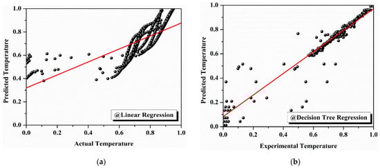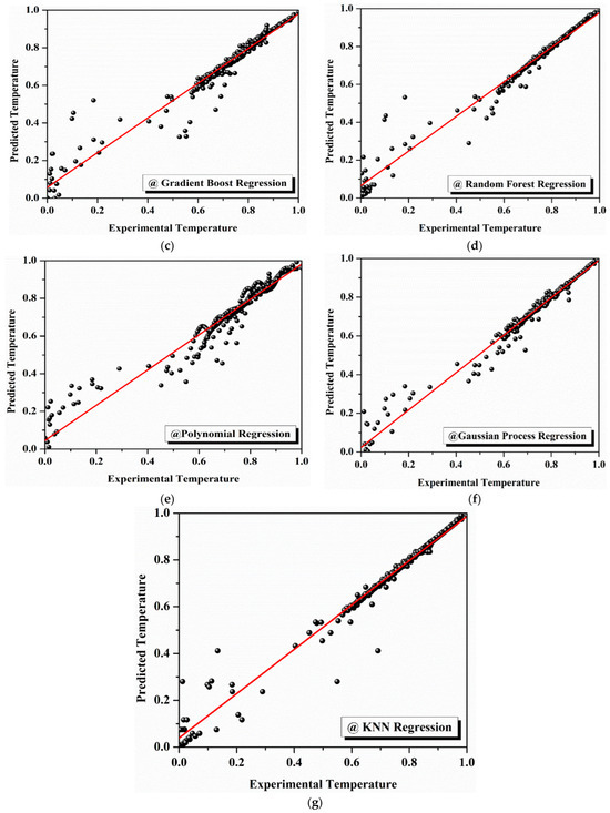 Machine learning models for thermal property prediction: (a) comparison of actual and predicted temperatures using linear regression; (b) comparison of actual and predicted temperatures using decision tree regression; (c) comparison of actual and predicted temperatures using gradient boost regression; (d) comparison of actual and predicted temperatures using random forest regression; (e) comparison of actual and predicted temperatures using polynomial regression; (f) comparison of actual and predicted temperatures using Gaussian process regression; (g) comparison of actual and predicted temperatures using KNN regression.