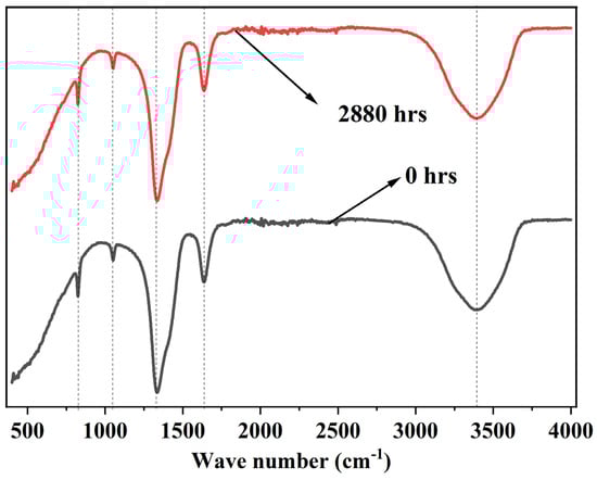 FTIR spectra of composite solar salt PCM before and after 2880 hrs exposure near onset of degradation temperature.